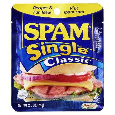Pouch of SPAM Singles Classic. Canned Clams last for. Spam is great in sandwiches stir fries burgers omelets tacos and others.